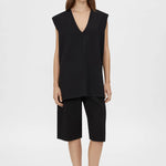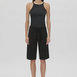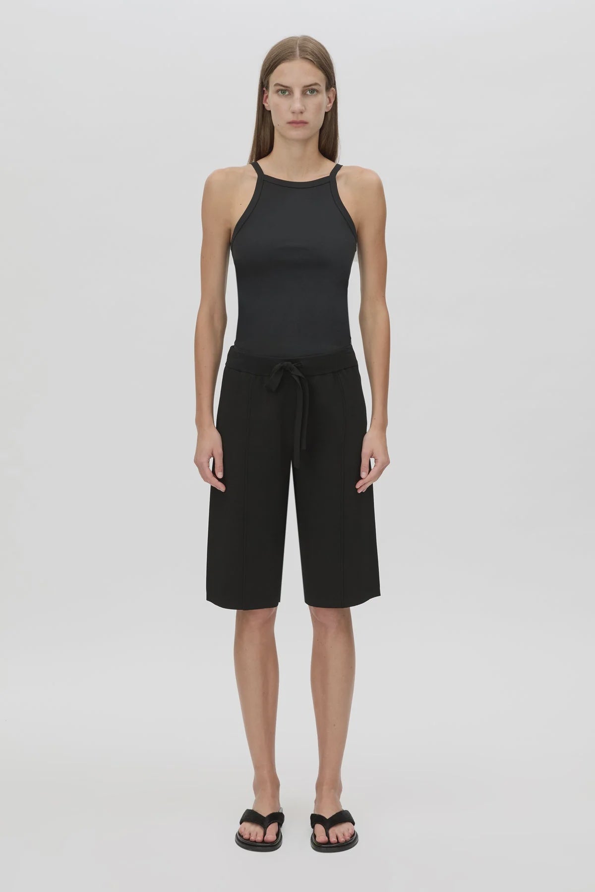 Donatello A-line mid-length knit short in black. Double faced knit with contrast internals.