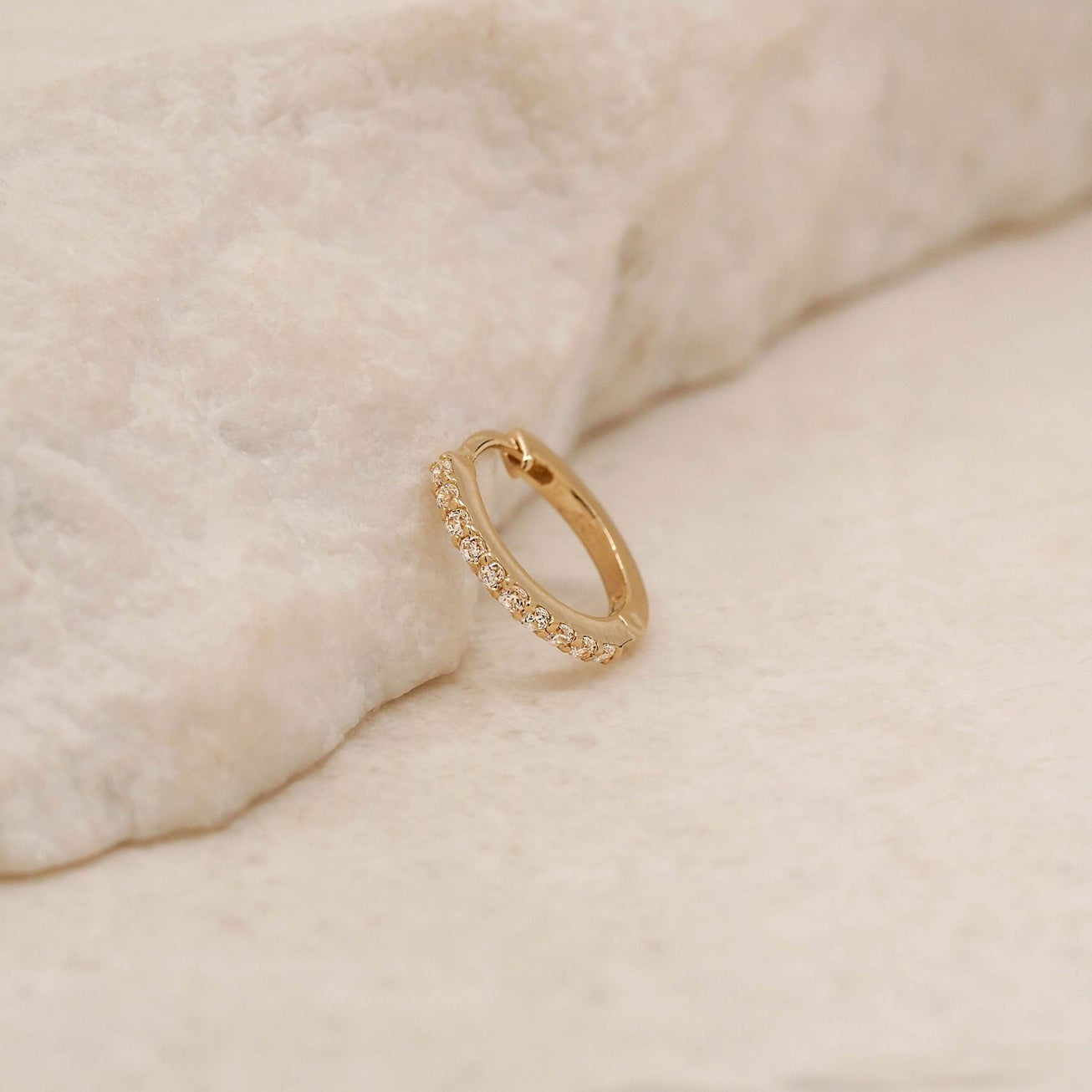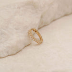 Encrusted with crystals, our 14k Gold Celestial Sleeper is an ode to the heavenly planes and the magical night sky. This delicate sparkling hoop was made to be adorned and layered; a versatile must-have.