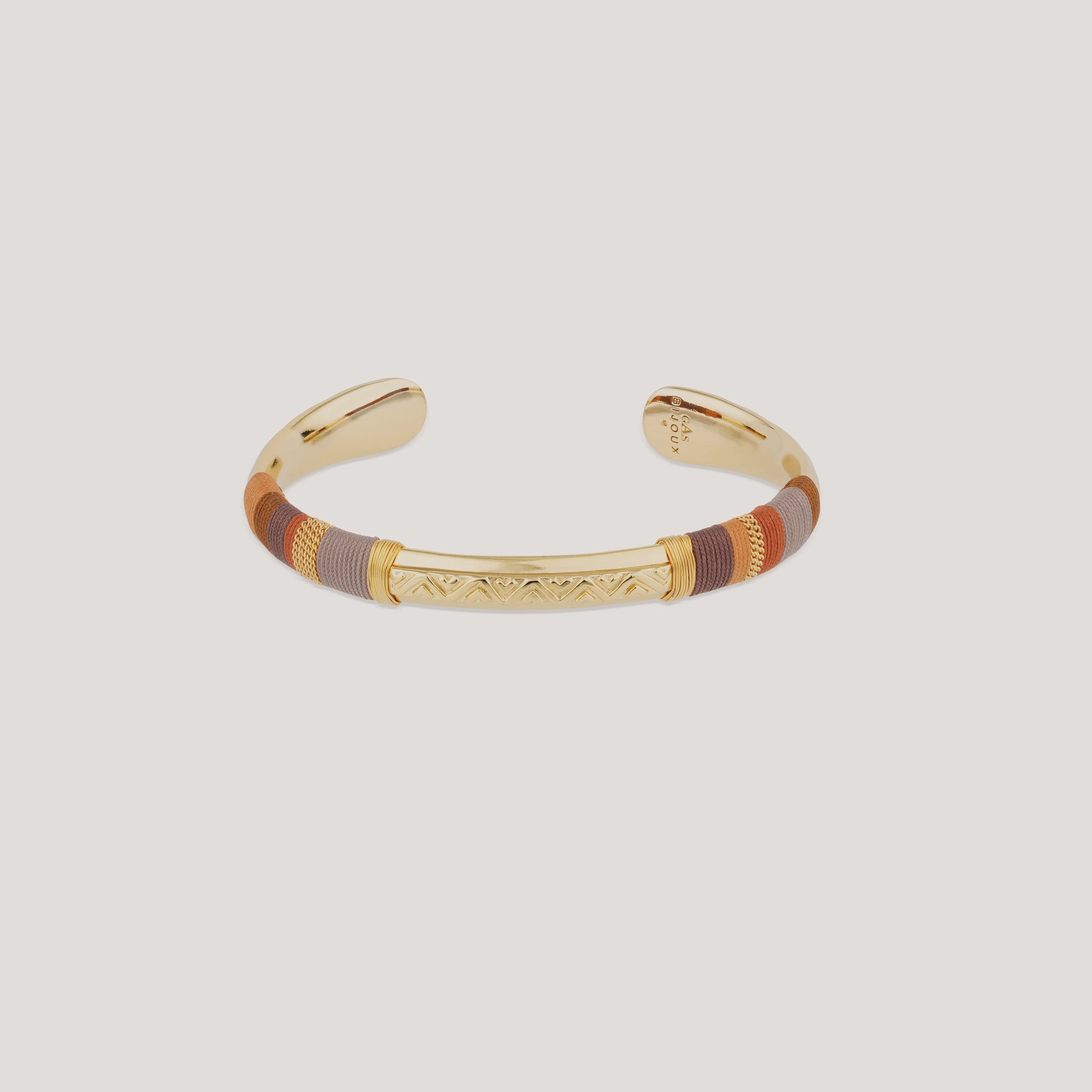 Gold plated bangle wrapped in polyester threads and gold wire. The mix of vegetal and animal, organic and mineral invites you on a voyage. Adjustable size.