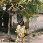 The Brezza Luna Flare is a bold expression of bohemian resort style, cut in a silky fabric that flows effortlessly with every step. Featuring a vibrant retro floral print in sunset orange, aqua, and lime, these high-waisted flare pants are finished with intricate crochet lace trim at the hem for a touch of artisanal detail.