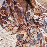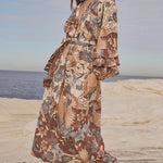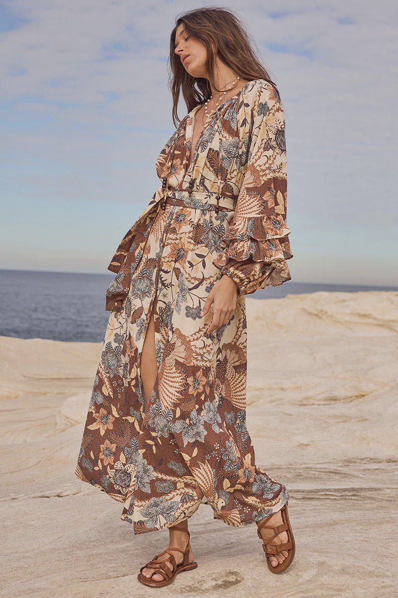 The Volcano Goddess Gown in Coconut radiates playful elegance with a touch of bohemian charm. Made from 100% organic cotton crinkle, its custom Spell allover print adds a signature flair. Featuring a front button opening, adjustable neck and waist ties, elastic cuffs, and delicate sleeve frill details, this gown embraces effortless beauty and feminine freedom—perfect for awakening your inner goddess with every wear.