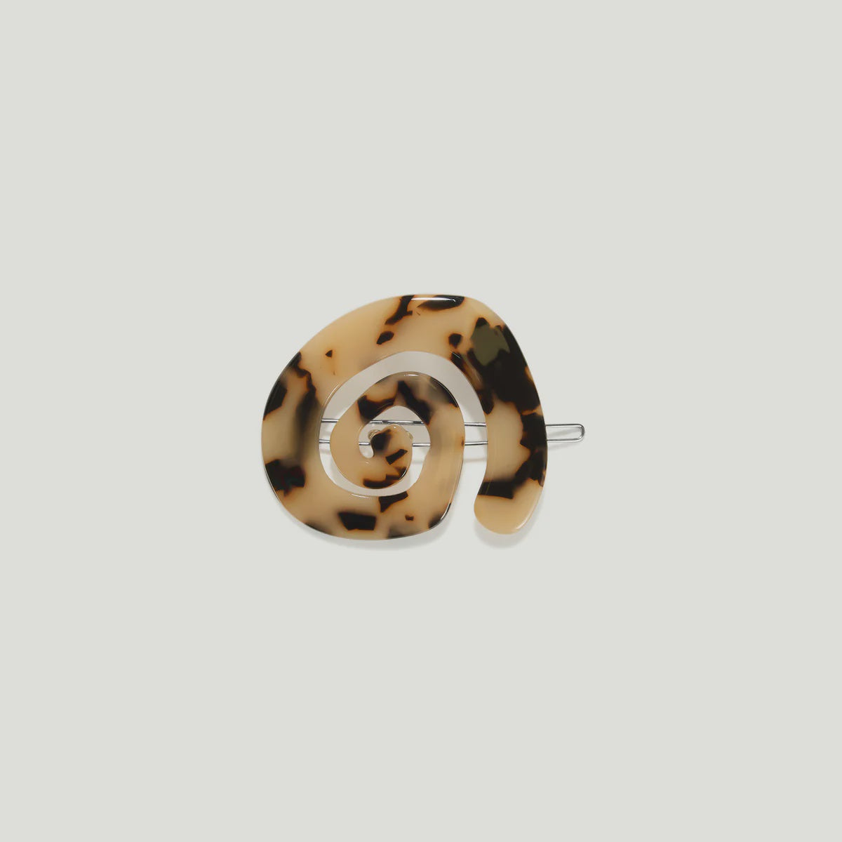 The Swirl Tige Boule is inspired by abstract art and architecture, with a sculptural flowing swirl in an organic hand-drawn shape, on a silver ball-closure hair barrette.