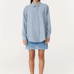 A ROWIE icon, now in Cornflower. The Marina Mini is a bias-cut silk slip skirt with a lace hem, high waist, and fluid drape, grounded by an elastic waistband.