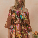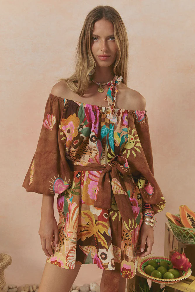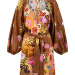 The Birth of Venus Tunic Dress in caramel blends playful charm with effortless style. Crafted from breathable linen and organic cotton, it features an elasticated neck and sleeve cuffs for easy, comfortable wear. Raglan sleeves and a self waist tie create a flattering silhouette, while the mini length adds a fun, flirty edge. Finished with a custom Spell print, this dress is perfect for carefree days with a touch of artistic flair.