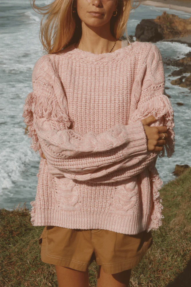 Stay comfy and stylish in our Nomadic Knit Jumper, reimagined in the soft and chic dusty rose colourway. The perfect mix of boho and urban, the boat neck features cable knit and fringing detail. Oversized for that effortless look, it's the perfect piece to add to your cozy weather rotation.