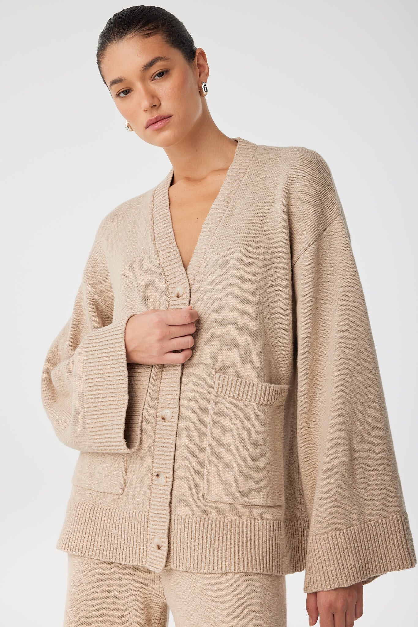 A softly structured cardigan with a relaxed fit and tactile slub texture. Designed with front patch pockets, wide sleeves, and a gentle drape through the body. Versatile for layering across seasons, this piece combines comfort and form with effortless ease.