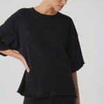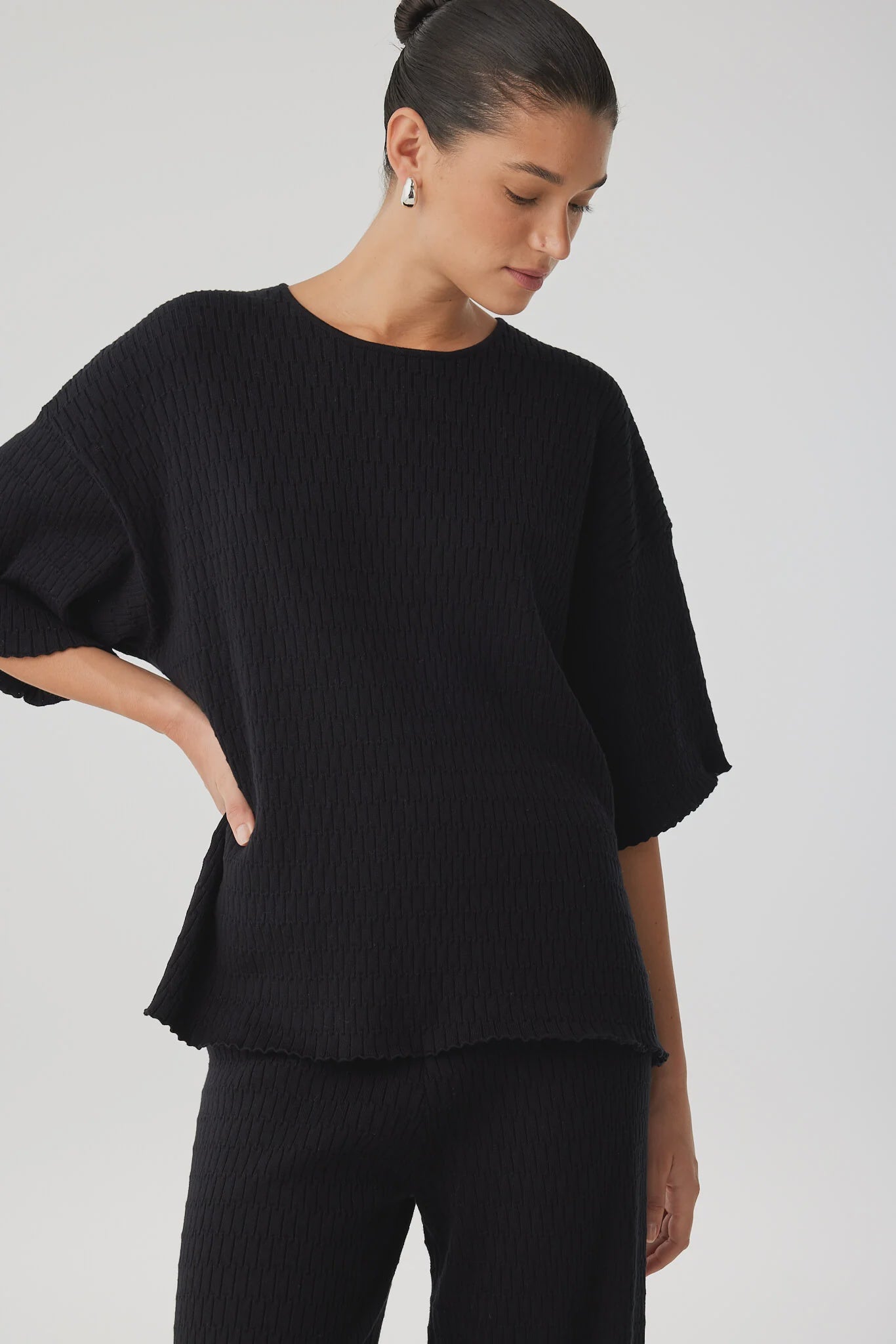 A modern take on the classic tee, the Jude is crafted in a softly structured textured knit. The silhouette is oversized and easy, with a refined drape and wide sleeves. Finished with a simple crew neck and clean edge.