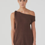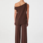 The Olympia Asymmetric Top in Espresso is a refined knit silhouette designed with an off-shoulder neckline, subtle side twist, and slit detail. Knitted from 100% cotton, it offers soft structure and lightweight movement; an effortless piece for layering or paired with the Olympia Pant as a co-ord set.