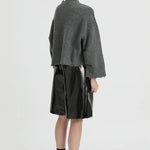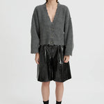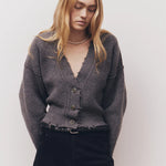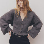 The Pepa Cardigan redefines cozy with a fierce attitude. Cut in a sculptural silhouette from a soft wool-blend knit, this cropped cardigan features wide, dramatic sleeves, raw-edge hems, and an artfully distressed finish. Its deep V-neckline and bold button closure channel effortless cool, while the structured fit cinches subtly at the waist for a flattering, modern shape.