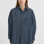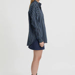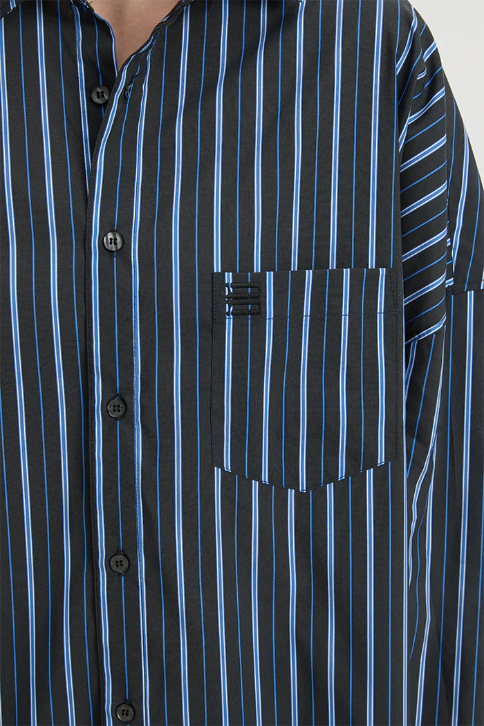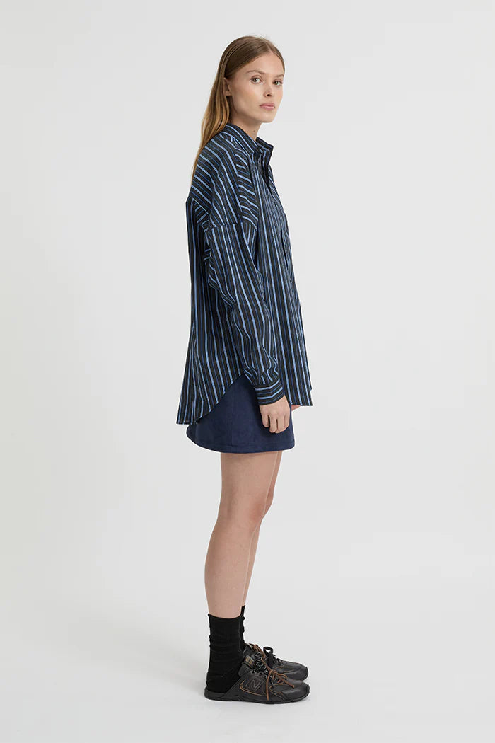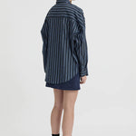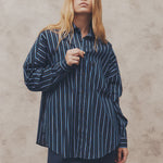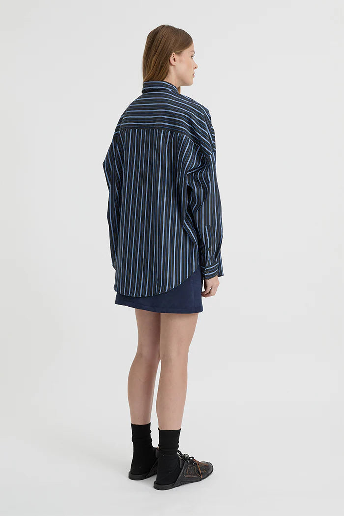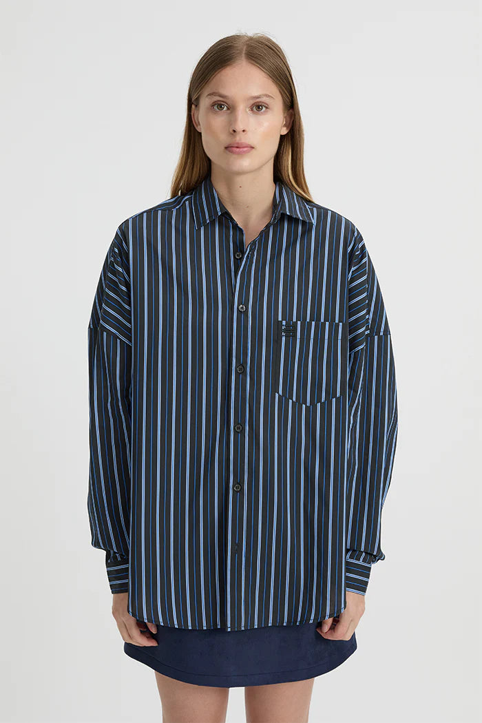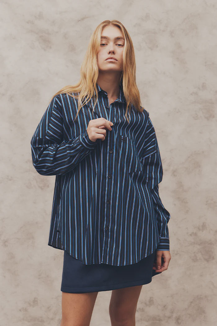 The Renata Shirt is your new go-to for elevated everyday style. Designed with a modern oversized fit, this statement piece features bold vertical stripes in deep navy and electric blue tones, adding instant edge to any wardrobe. Crafted from a soft, breathable cotton blend, it offers all-day comfort without compromising on style. The dropped shoulders and exaggerated cuffs bring a relaxed silhouette, while the subtle chest pocket and classic collar keep it rooted in timeless shirting tradition.