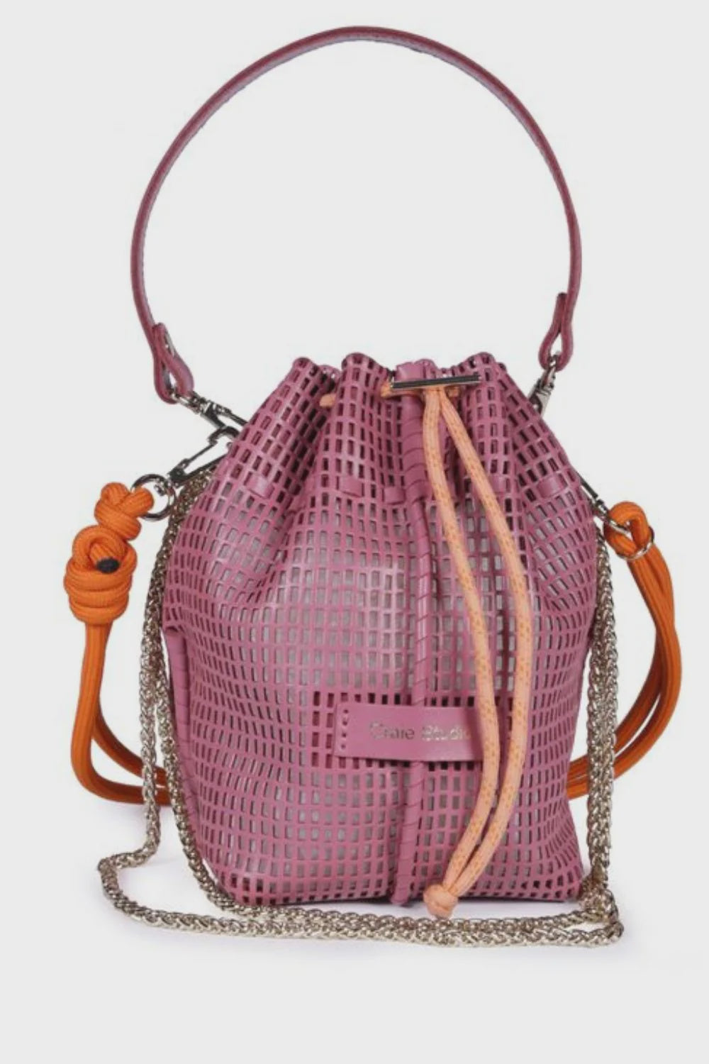 • A standout metallic bucket bag with intricate perforation for a unique, contemporary vibe.