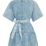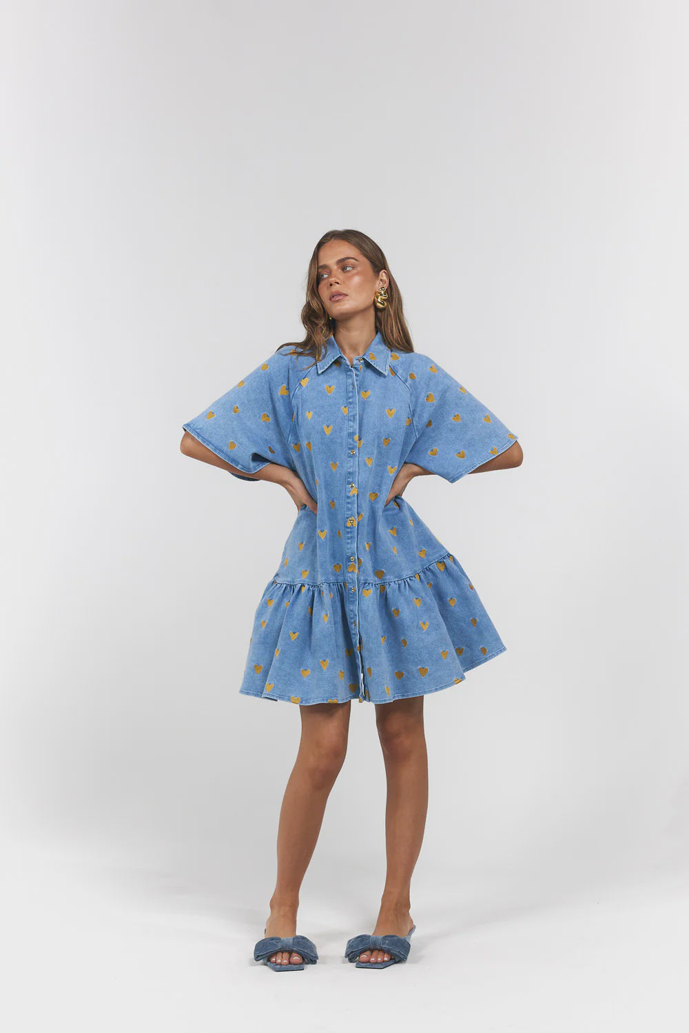Moxie Mini Dress – Denim Hearts Our cult-favourite Moxie Mini returns, now reimagined in our new light coloured, soft washed denim adorned with signature gold heart embroidery.