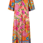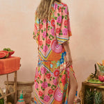The Aphrodite Gown in Rose channels bold romanticism with its striking print inspired by effortless freedom. Raglan sleeves and a soft V-neck create a flattering frame, while the self neck tie with beaded ends adds a touch of daring detail. A dropped waist seam and side hem splits enhance movement, making this gown a fearless statement of elegance and ease.