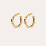 Gold-plated hoop earrings, striated and embellished with ornamental hand-settings and delicate twisted bows.