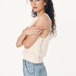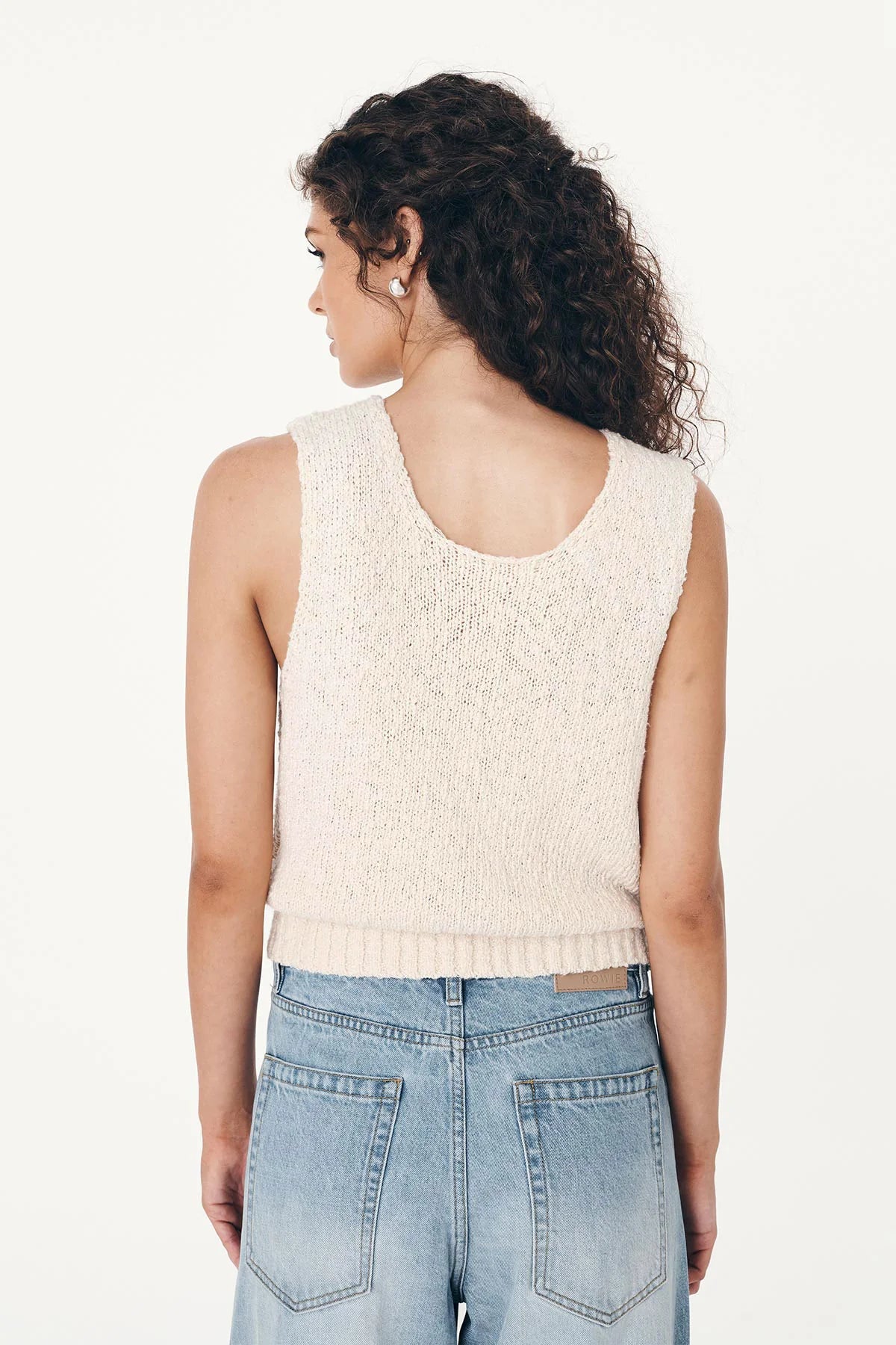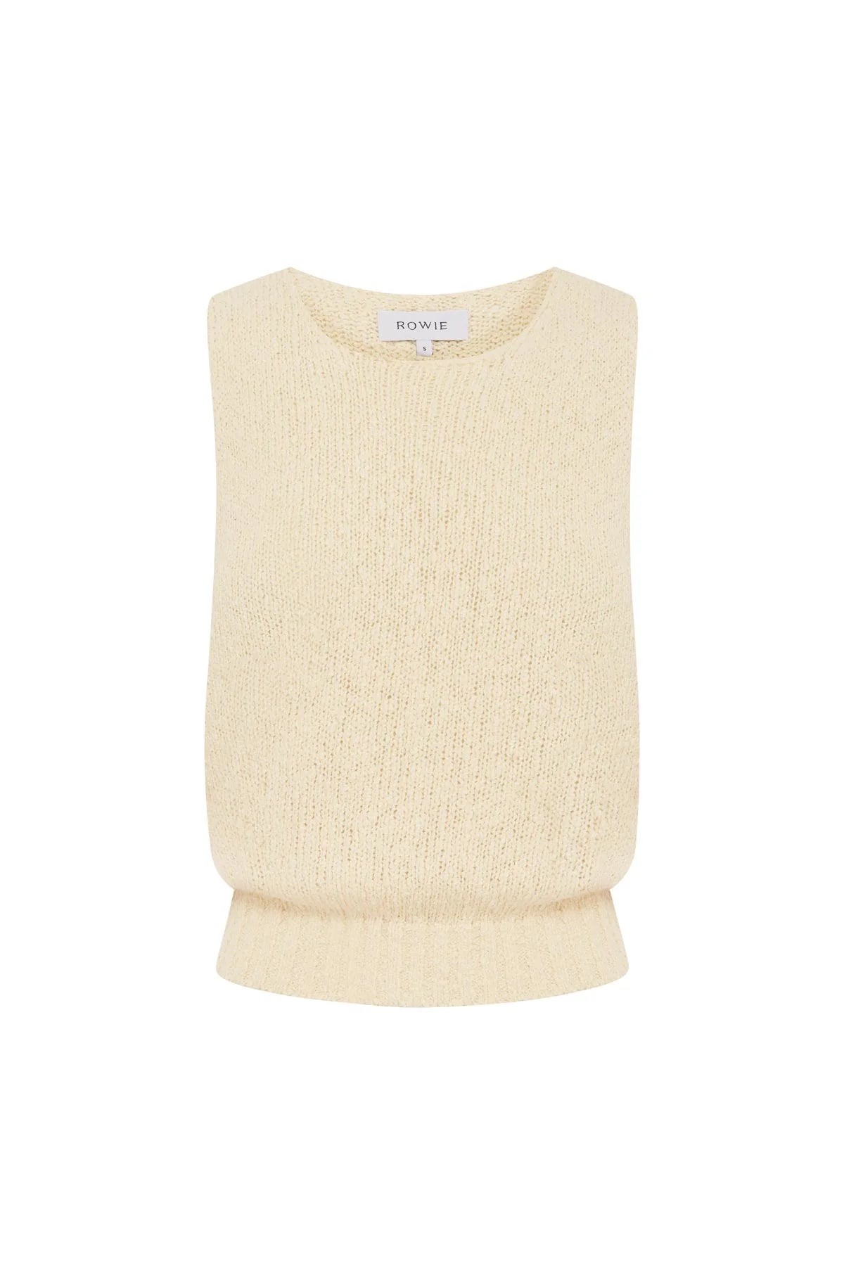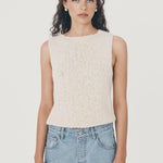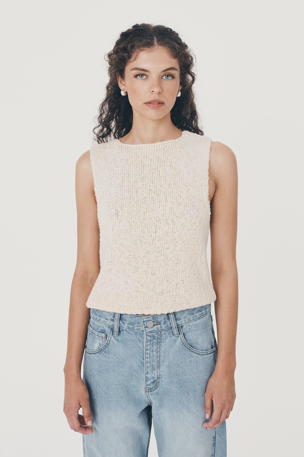 Lightweight textured yarn defines the Catalina Tank. A relaxed full-length knit with dropped armholes, side ladder detailing, and a ribbed hem finish.