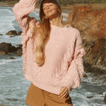 Stay comfy and stylish in our Nomadic Knit Jumper, reimagined in the soft and chic dusty rose colourway. The perfect mix of boho and urban, the boat neck features cable knit and fringing detail. Oversized for that effortless look, it's the perfect piece to add to your cozy weather rotation.
